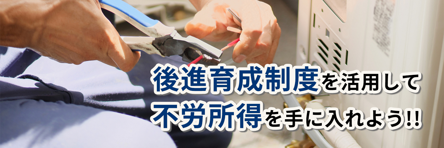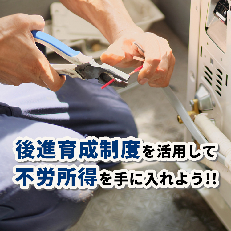 後進育成制度とは、エアコン取り付け工事の経験が浅い方、または業界未経験の方に対して、現場で必要となる作業内容・施工の考え方・注意点などを共有し、一人で現場対応ができるレベルまで育成していただく制度です。
